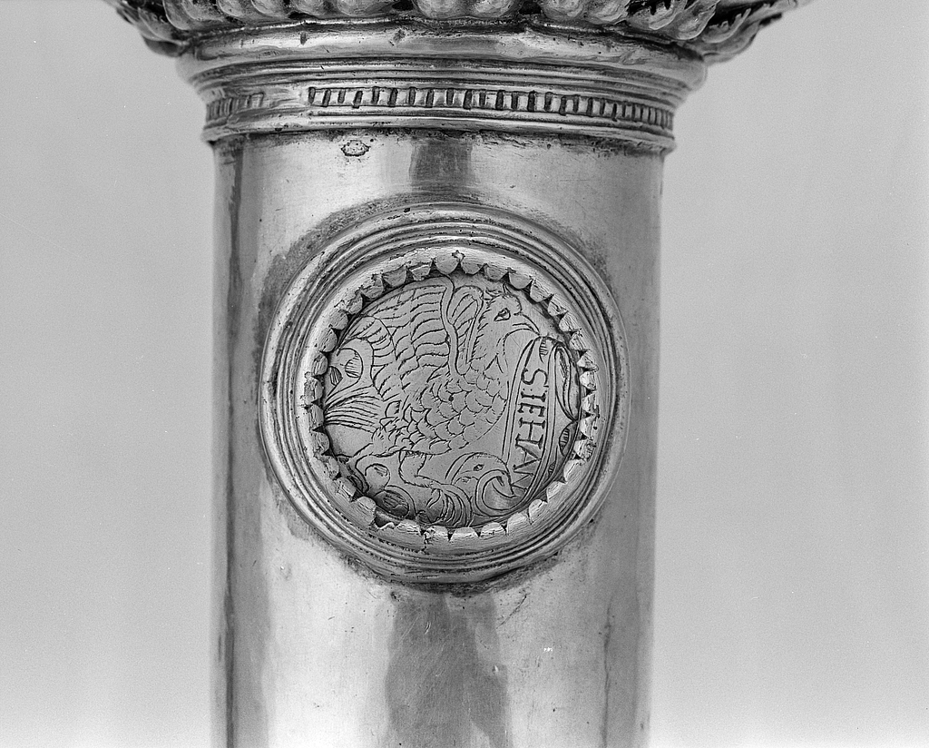 Croix de procession, détail du médaillon situé sur la traverse de la croix : saint Jean.Immatriculation