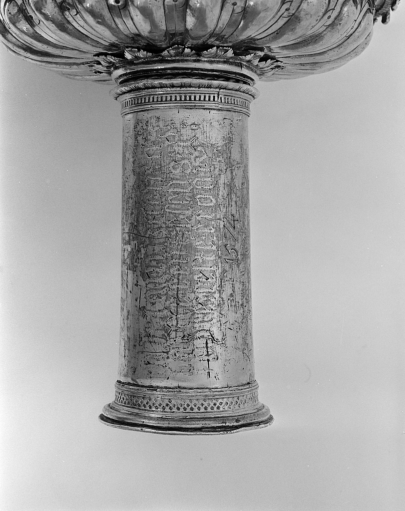 Croix de procession, détail de l'inscription sur la hampe.Immatriculation
