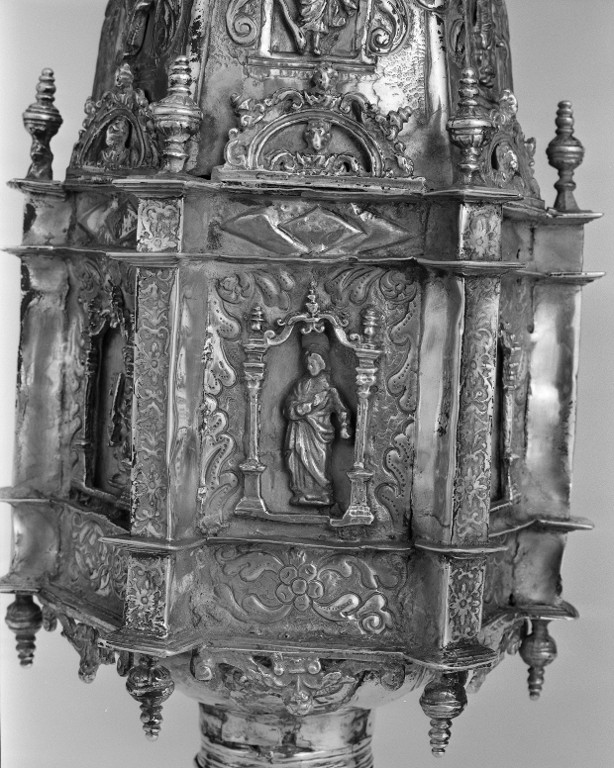 Détail du noeud : niche, apôtre et encadrement architectural.Immatriculation