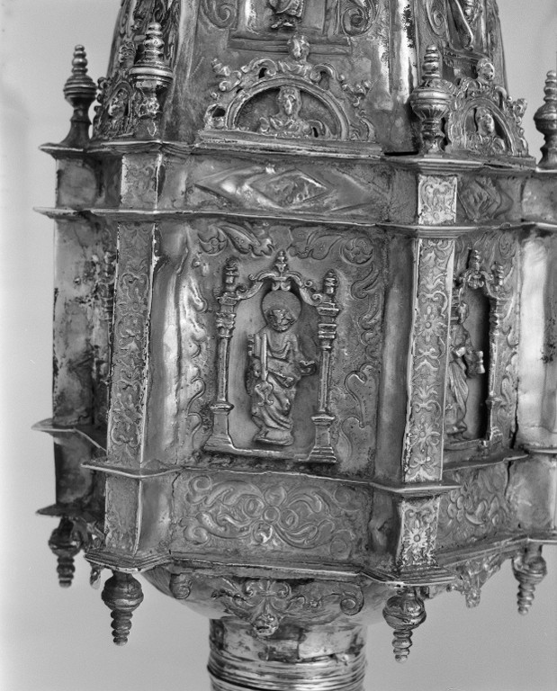 Détail du noeud : niche, apôtre et encadrement architectural.Immatriculation