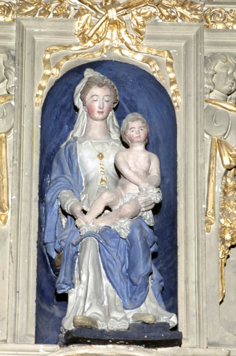Autel retable Nord : vue générale groupe sculpté de vierge à l'enfant assise en couronnement du retable.Immatriculation