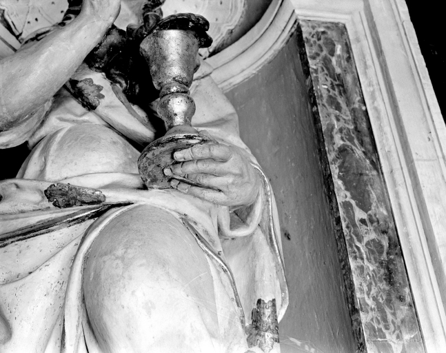Statue de Saint-Jean Evangéliste, détail main gauche.Immatriculation