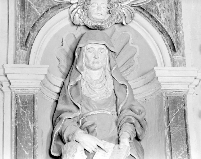 Groupe sculpté Saint-Anne + Vierge, détail de la tête de Saint-Anne.Immatriculation