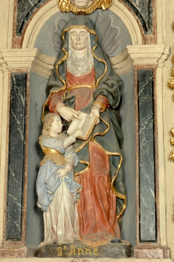 Groupe sculpté Sainte-Anne + Vierge (niche de gauche).Immatriculation
