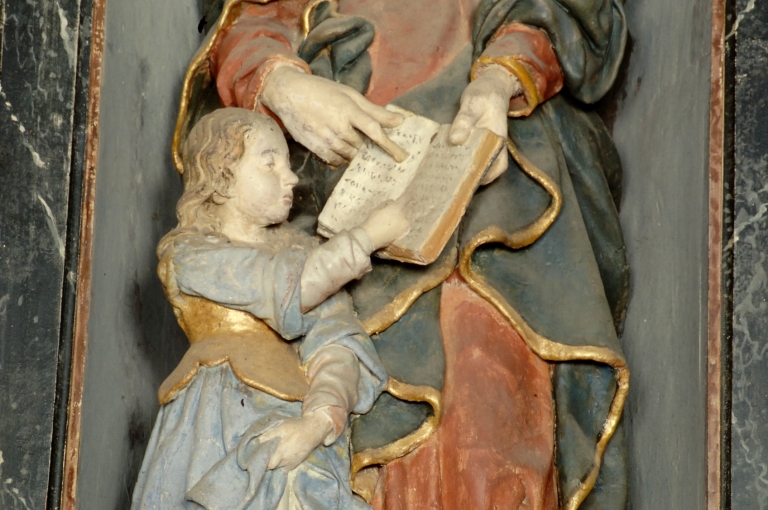 Groupe sculpté Sainte-Anne + Vierge, détail de la tête de la Vierge.Immatriculation