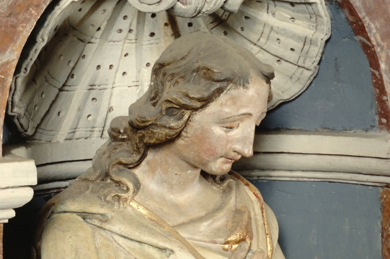 Détail de la tête de la statue de Saint-Jean-Evangéliste (profil).Immatriculation