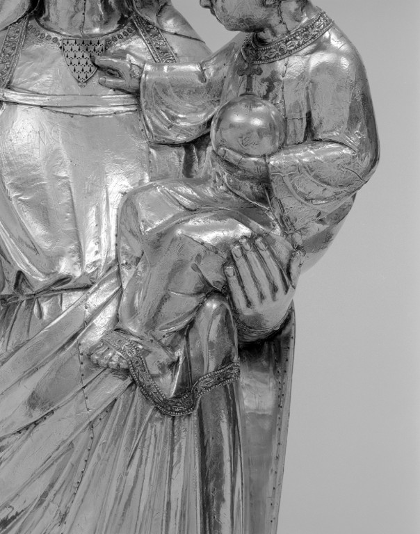Détail des mains de la Vierge et de l'Enfant.Immatriculation