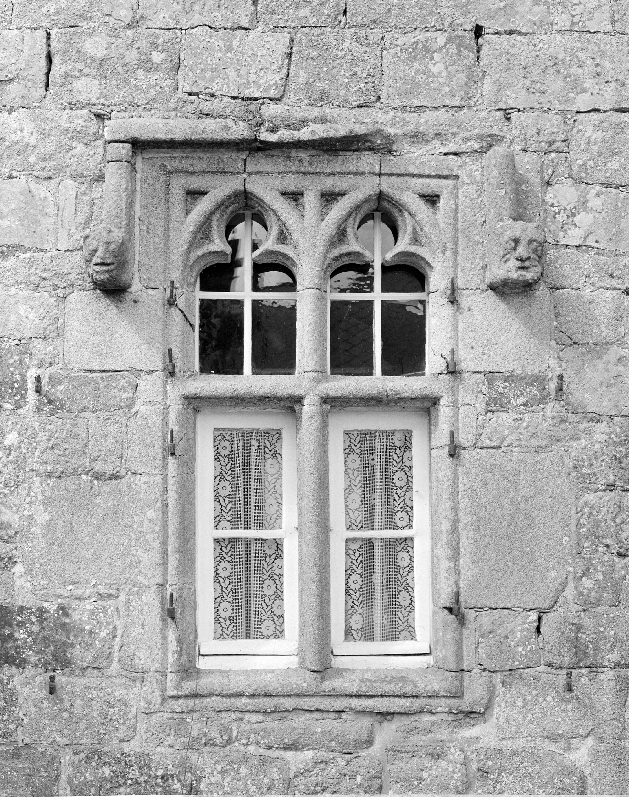 Ploubezre, Le Launay : manoir, élévation antérieure orientée vers le nord-est, vue de détail d'une baie à arcs trilobés jumelés, photographie de 1991Immatriculation