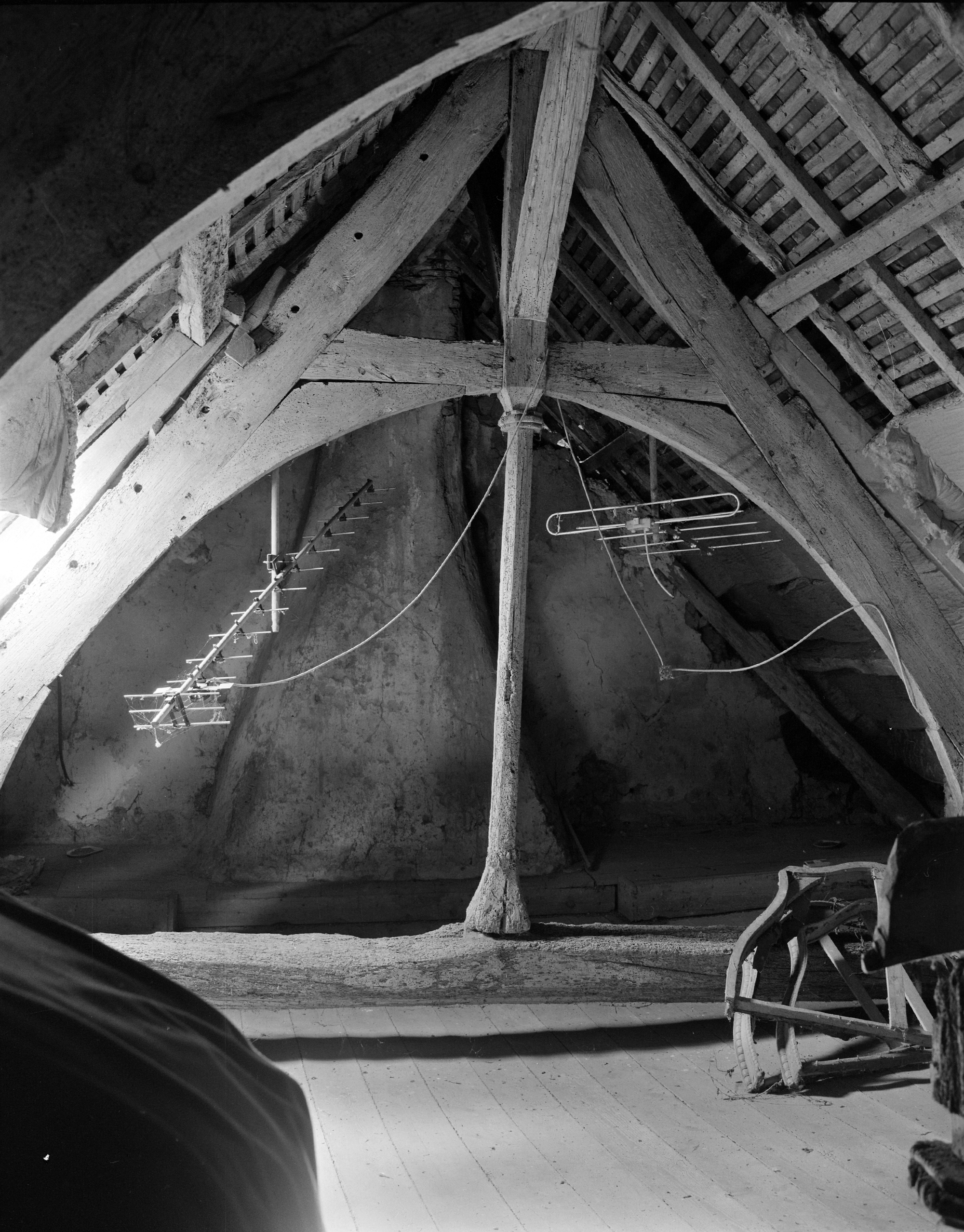 Ploubezre, Le Launay : manoir, vue de détail de la charpente à liens courbes, photographie de 1991Immatriculation