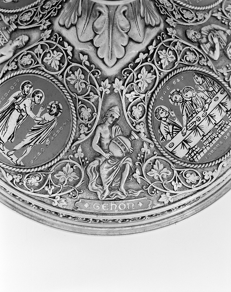 Calice, détail du pied, personnage et inscription 'Gehon'Immatriculation