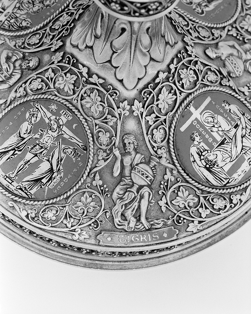 Calice, détail du pied, personnage et inscription 'Tigris'Immatriculation