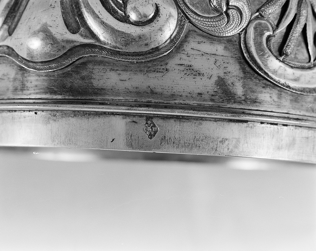 Détail de poinçon losangique sur le bord de la coupe.Immatriculation