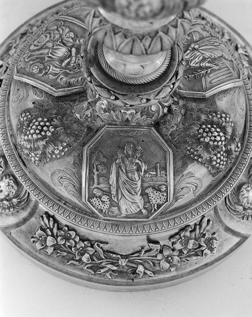 Détail du pied, motif Bon Pasteur.Immatriculation
