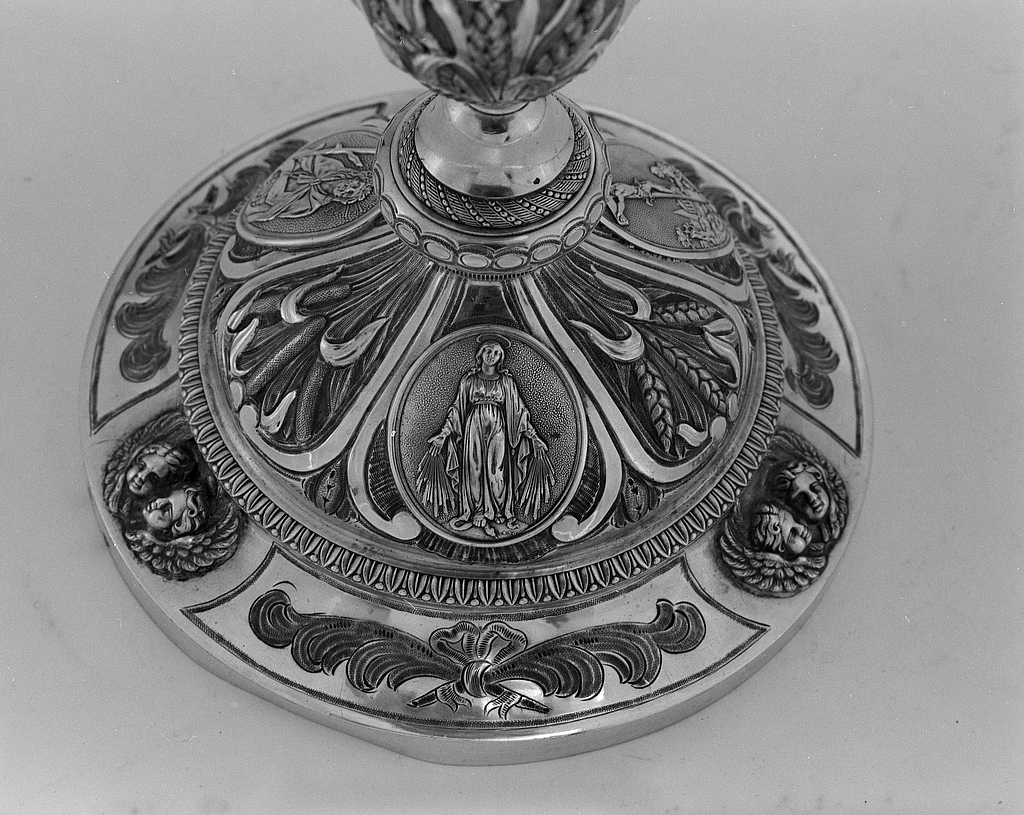 Détail du pied, médaillon de l'Immaculée Conception.Immatriculation