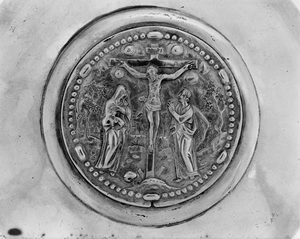 Détail de la patène, motif de la Crucifixion.Immatriculation
