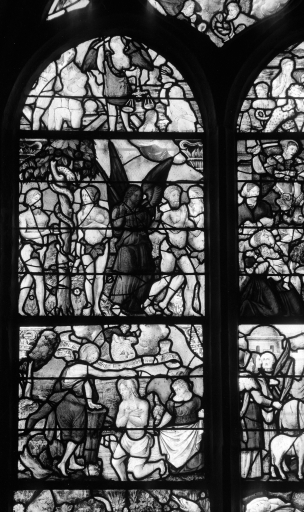 Verrière à personnages de la baie 3 : Paradis terrestre ; Enfance du Christ ; Baptême du Christ,