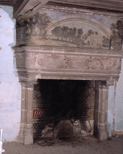 Logis, rez-de-chaussée surélevé, 2ème chambre, détail du décor peint de la cheminée, état avant restaurationImmatriculation