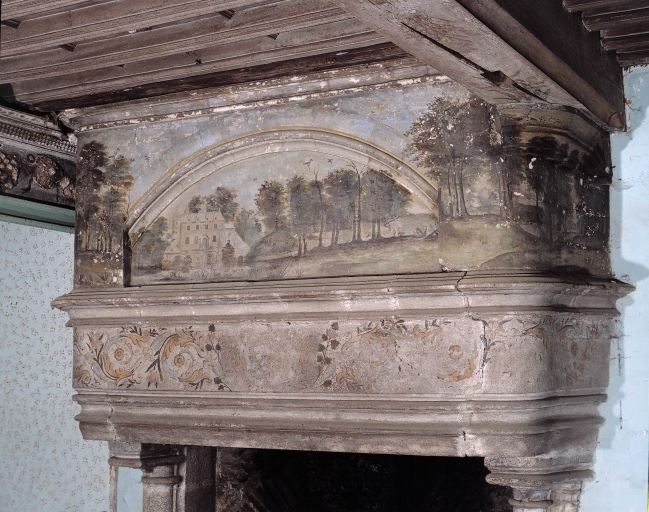 Logis, rez-de-chaussée surélevé, 2ème chambre, détail de la cheminée du rez-de-chausée, état avant restaurationImmatriculation