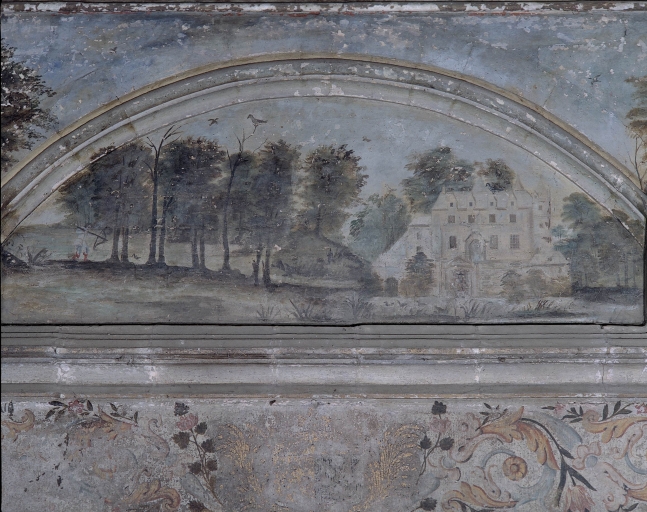 Logis, Rez-de-chaussée surélevé, 2ème chambre, détail du décor peint de la cheminée état avant restaurationImmatriculation
