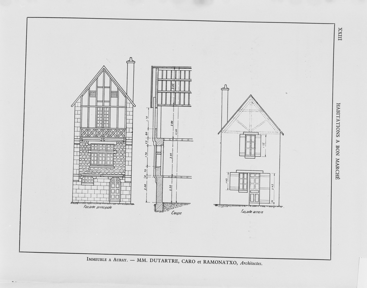 Maison, reproduction du recueil d'architecture, photographie de la planche XXV représentant immeuble à Auray, élévation principale.Immatriculation