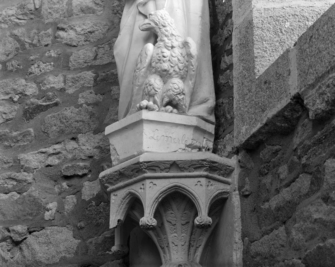 Statue 8, saint Jean Evangéliste, détail signature sur socle.Immatriculation