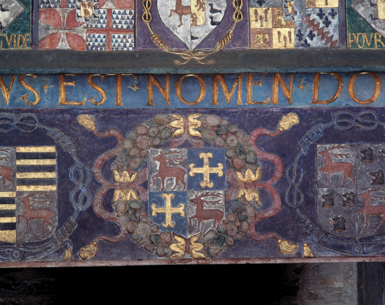 Château, cheminée, partie centrale du linteau : détail d'un blason.Immatriculation