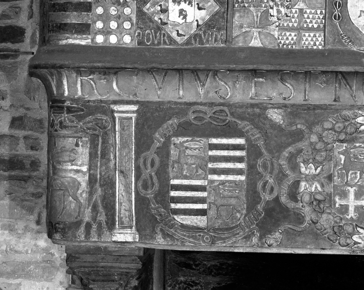 Château, cheminée, partie gauche du linteau : détail d'un blason.Immatriculation