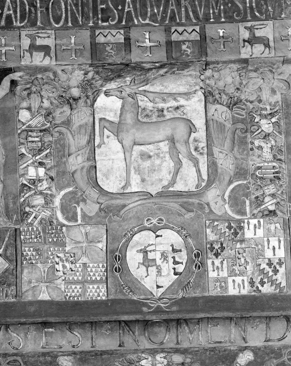 Château, cheminée, partie centrale de la hotte : détail du grand écu portant les armes au cerf passant.Immatriculation