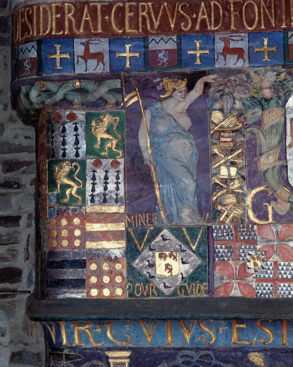 Château, cheminée, partie gauche de la hotte : détail de Minerve.Immatriculation