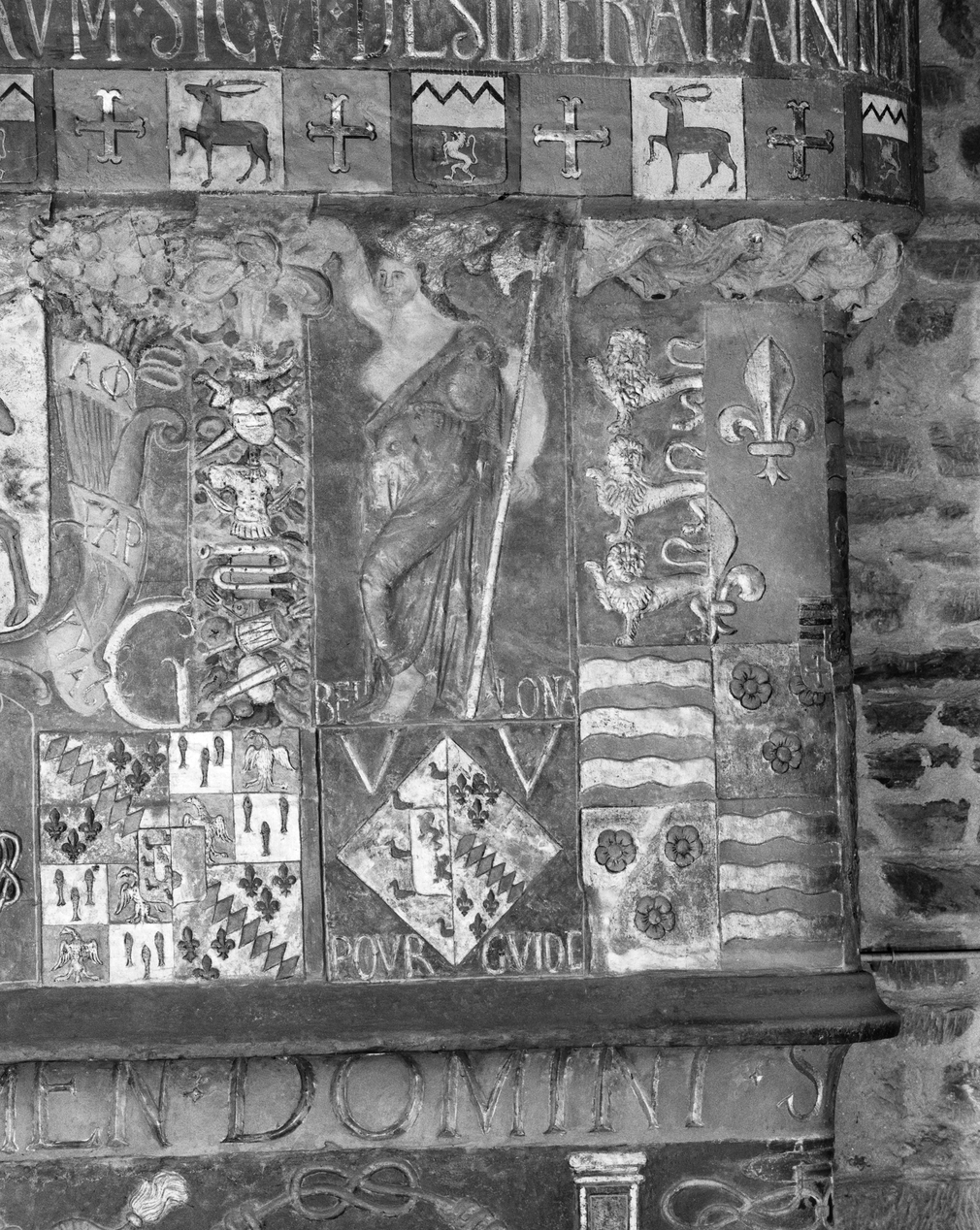 Château, cheminée, partie droite de la hotte : détail de Bellonne.Immatriculation
