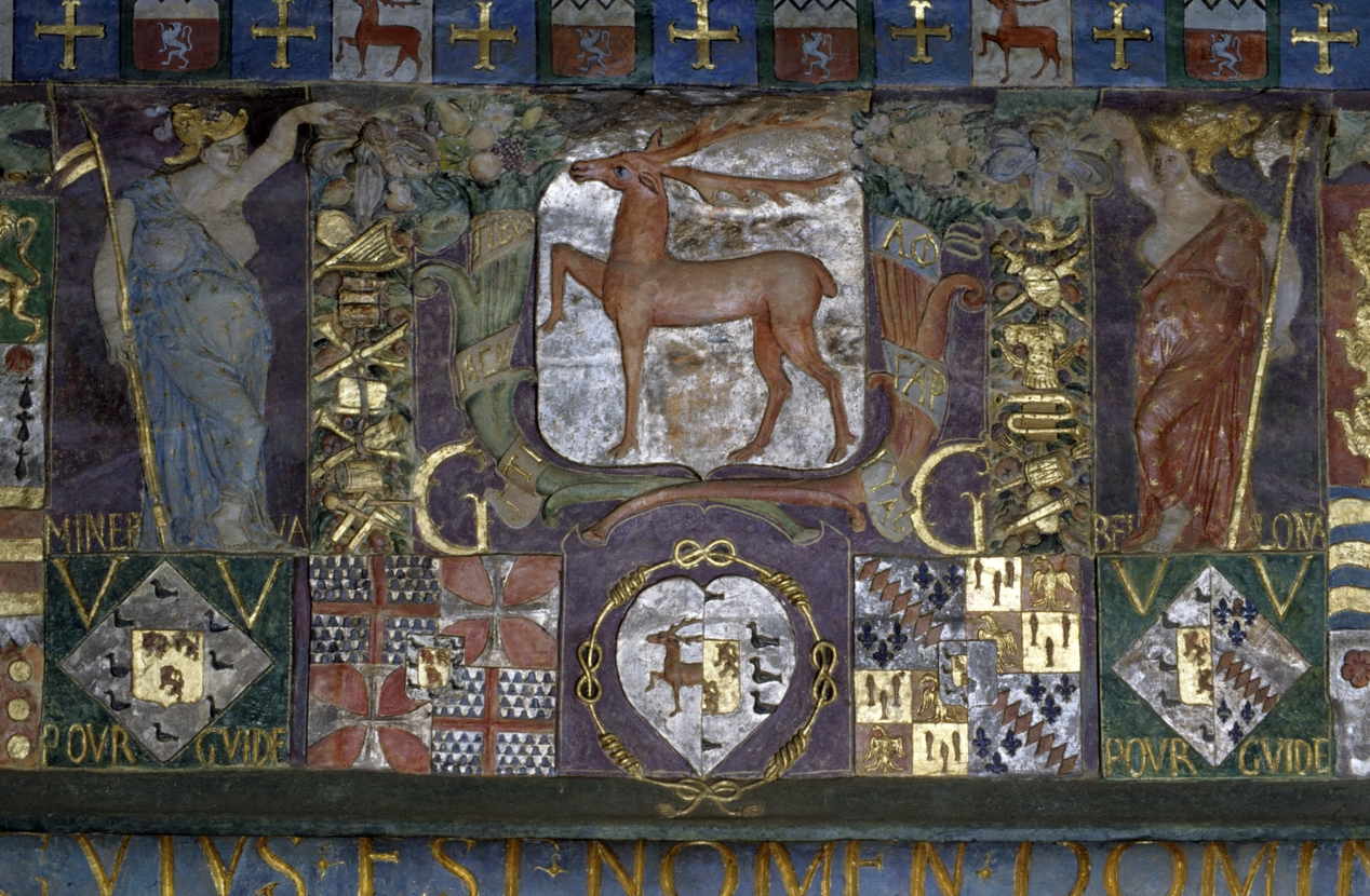 Château, cheminée, partie centrale de la hotte : détail du grand écu portant les armes au cerf passant.Immatriculation