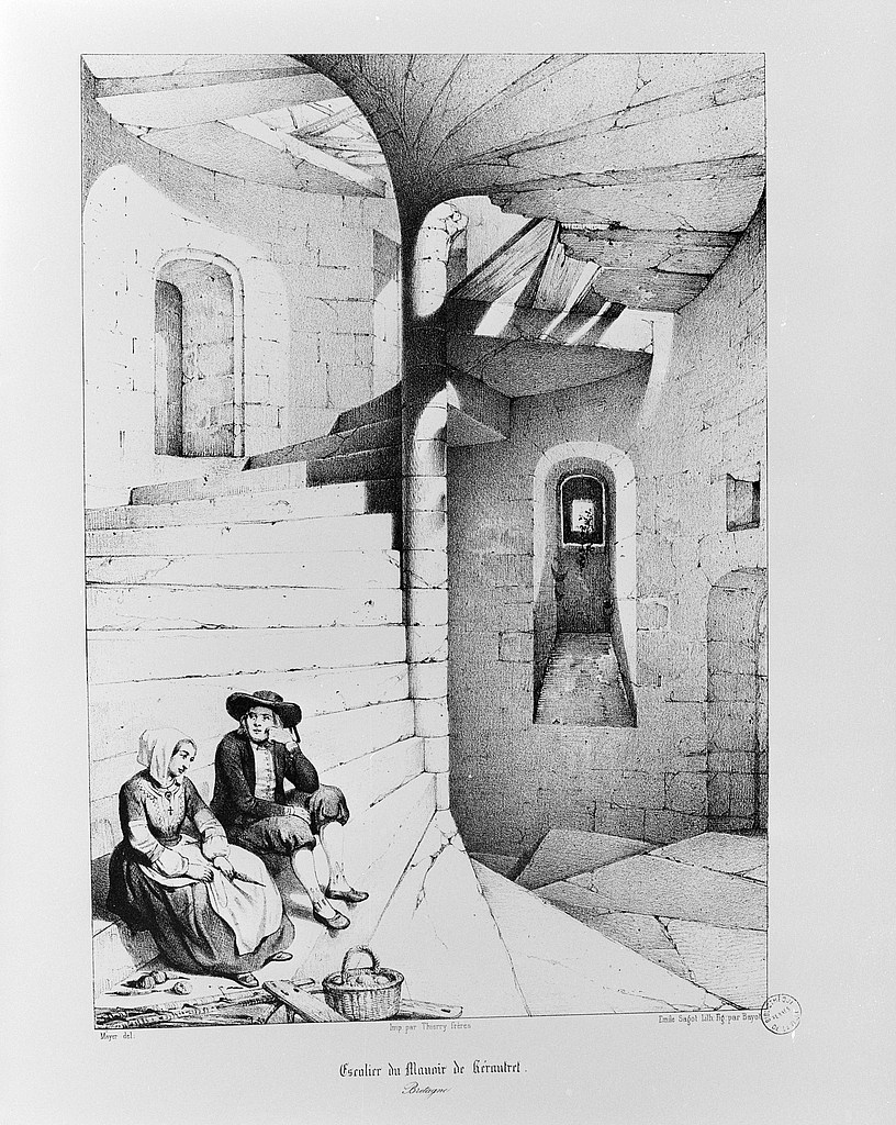 Reproduction - Manoir Kérautret, escalier intérieur, vue générale.Immatriculation