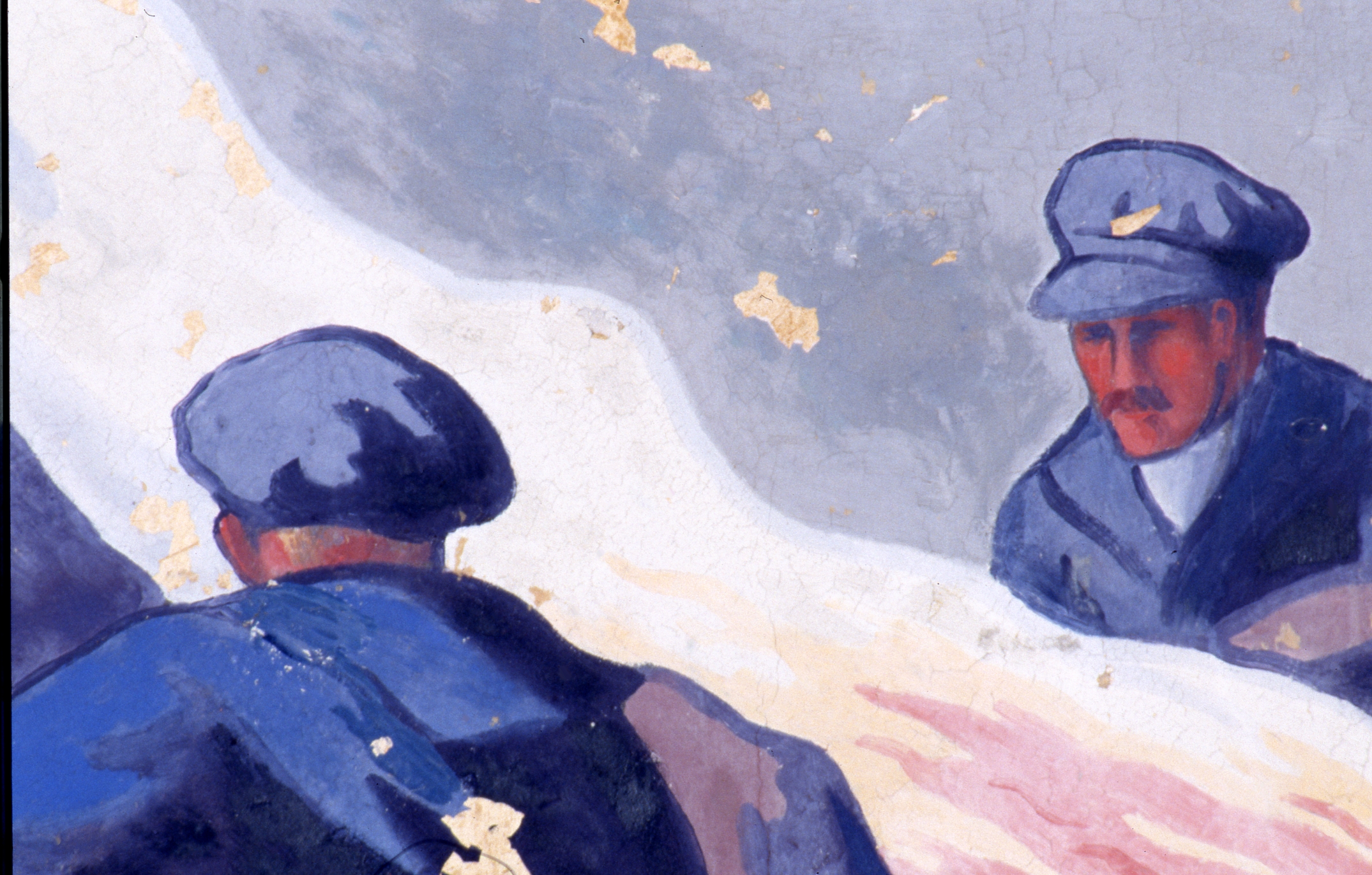 Panneau n°5 : personnages debout à droite de la scène, détail.Immatriculation