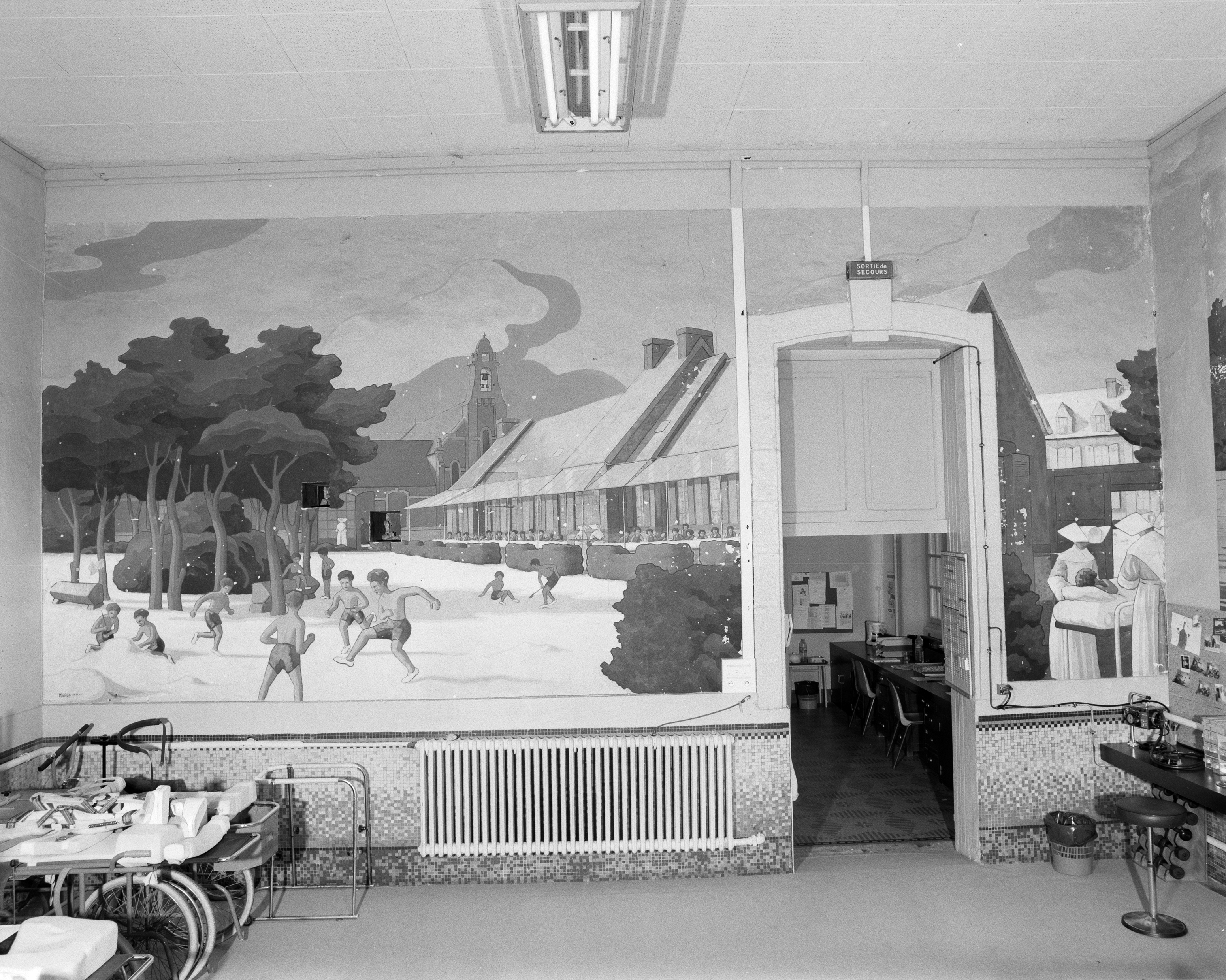 Panneaux n°8 et n°9 : vue d'ensemble, enfants jouant devant le centre hélio-marin et religieuse soignant un enfant alitéImmatriculation