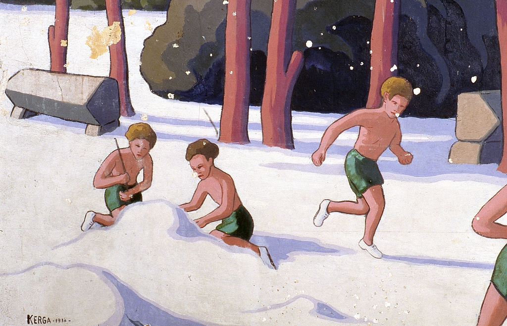 Panneau n°9 : personnages jouant dans le sable à gauche de la scène, détail.Immatriculation
