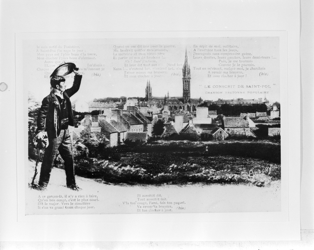 Vue de la ville et chanson populaire bretonne, carte postale ancienne.Immatriculation