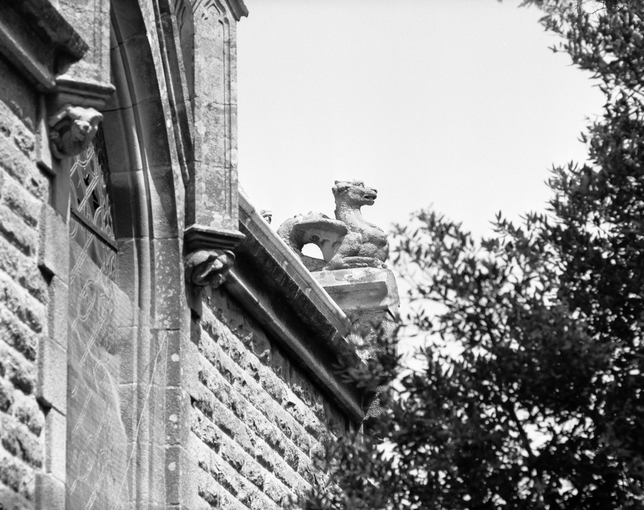 Chapelle, élévation est, angle nord-est : détail sculpté.Immatriculation