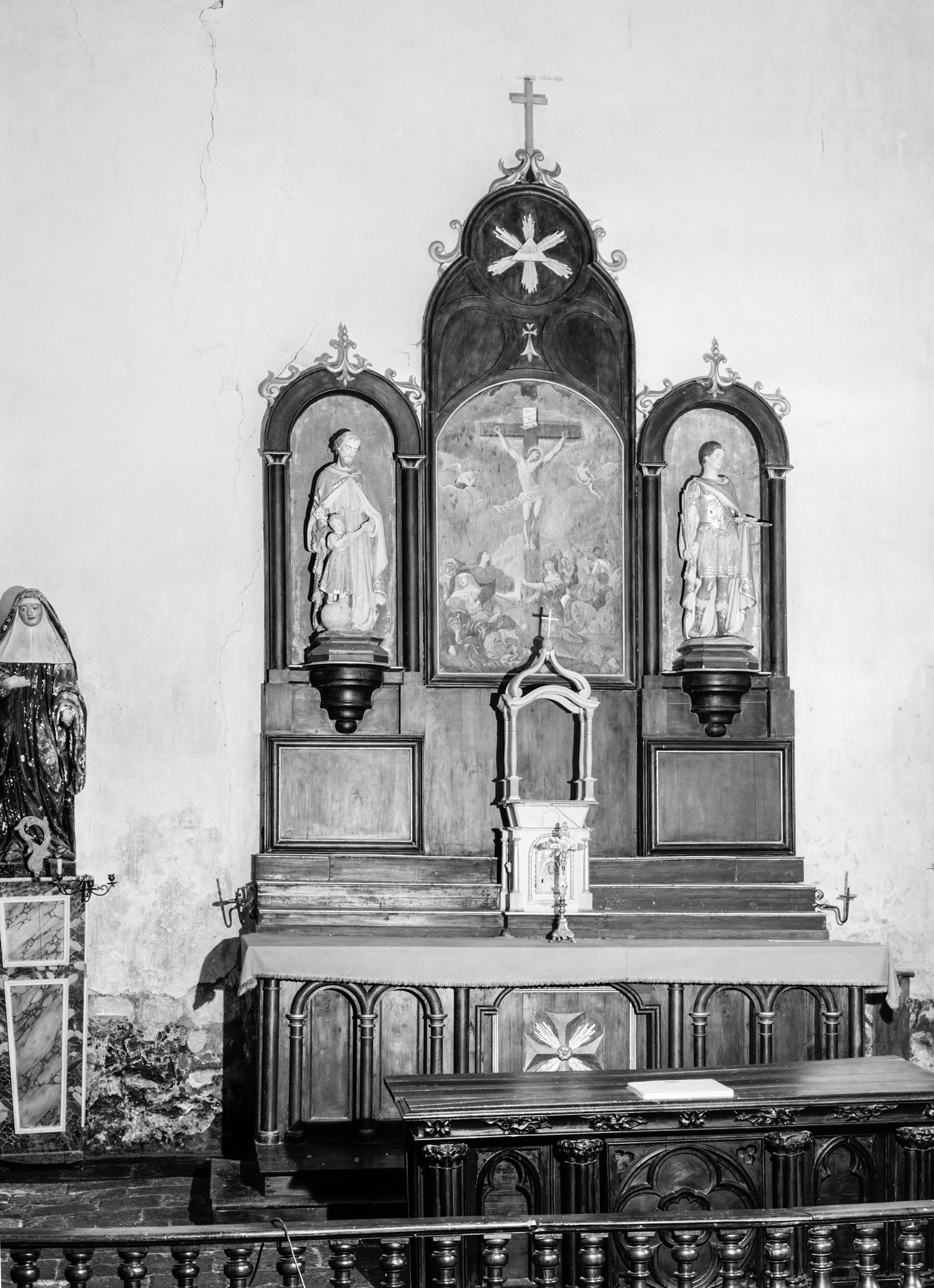 Ensemble du maître-autel : autel, retable, 2 statues : Saint Joseph et Saint Sébastien, chapelle Sainte-Croix (Josselin),
