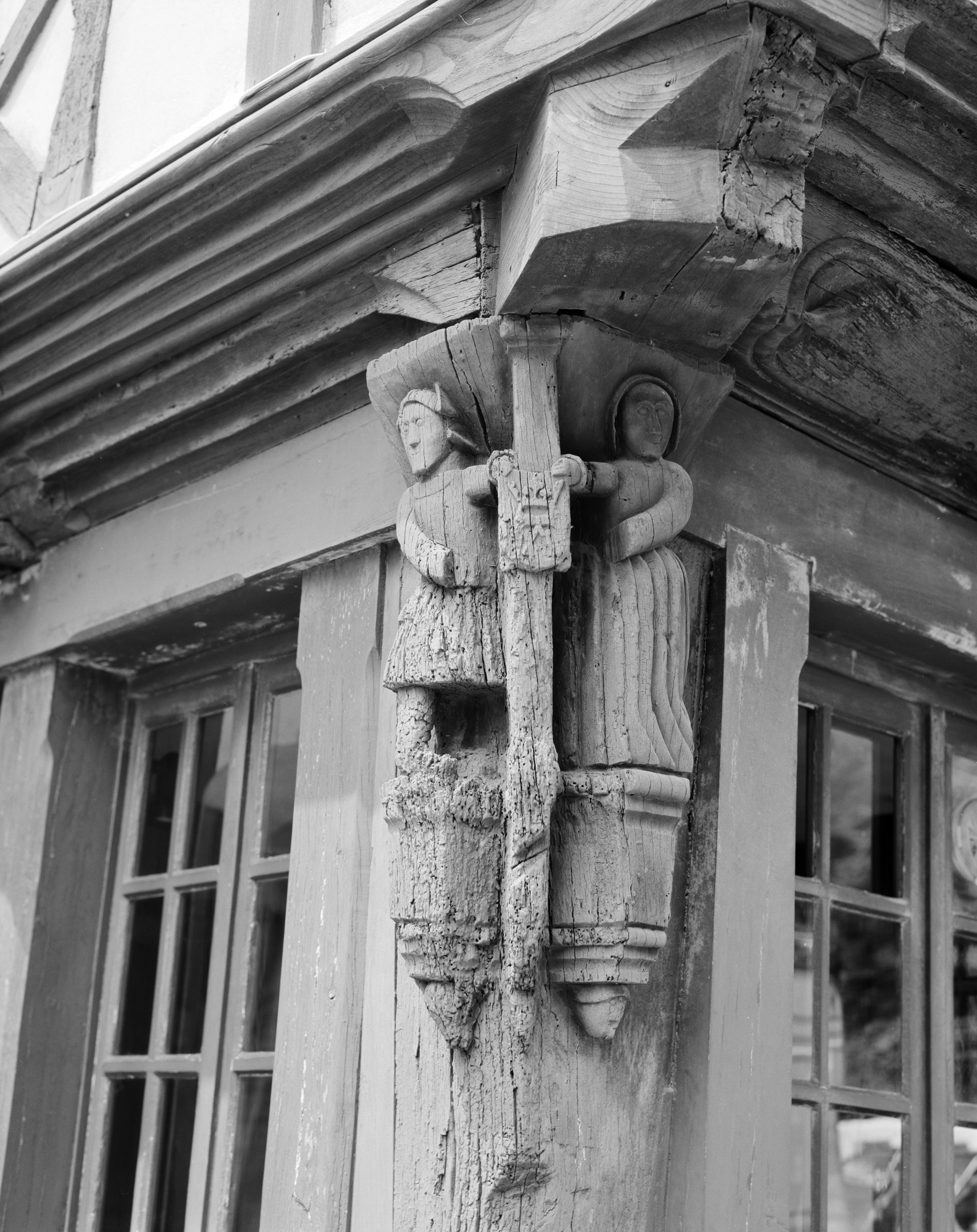 Maison, rez-de-chaussée, décor du poteau cornier : un homme et une femme présentent un écu avec une marque de marchand ou un monogramme (état en 1992)Immatriculation