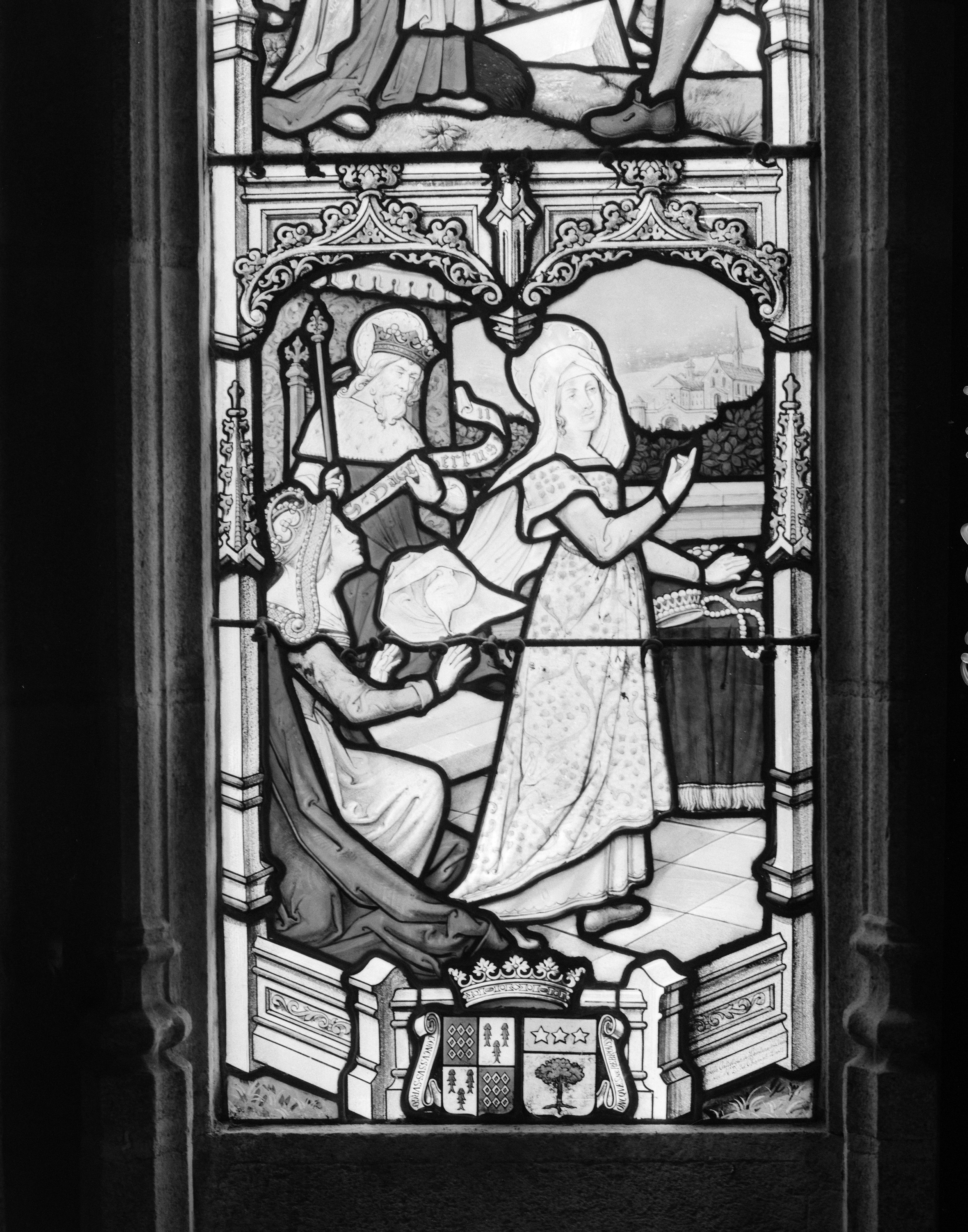 Verrière de la baie 2, registre inférieur : Saint Dagobert, la princesse Mathilde et leur fille sainte Adèle (état en 1992)Immatriculation