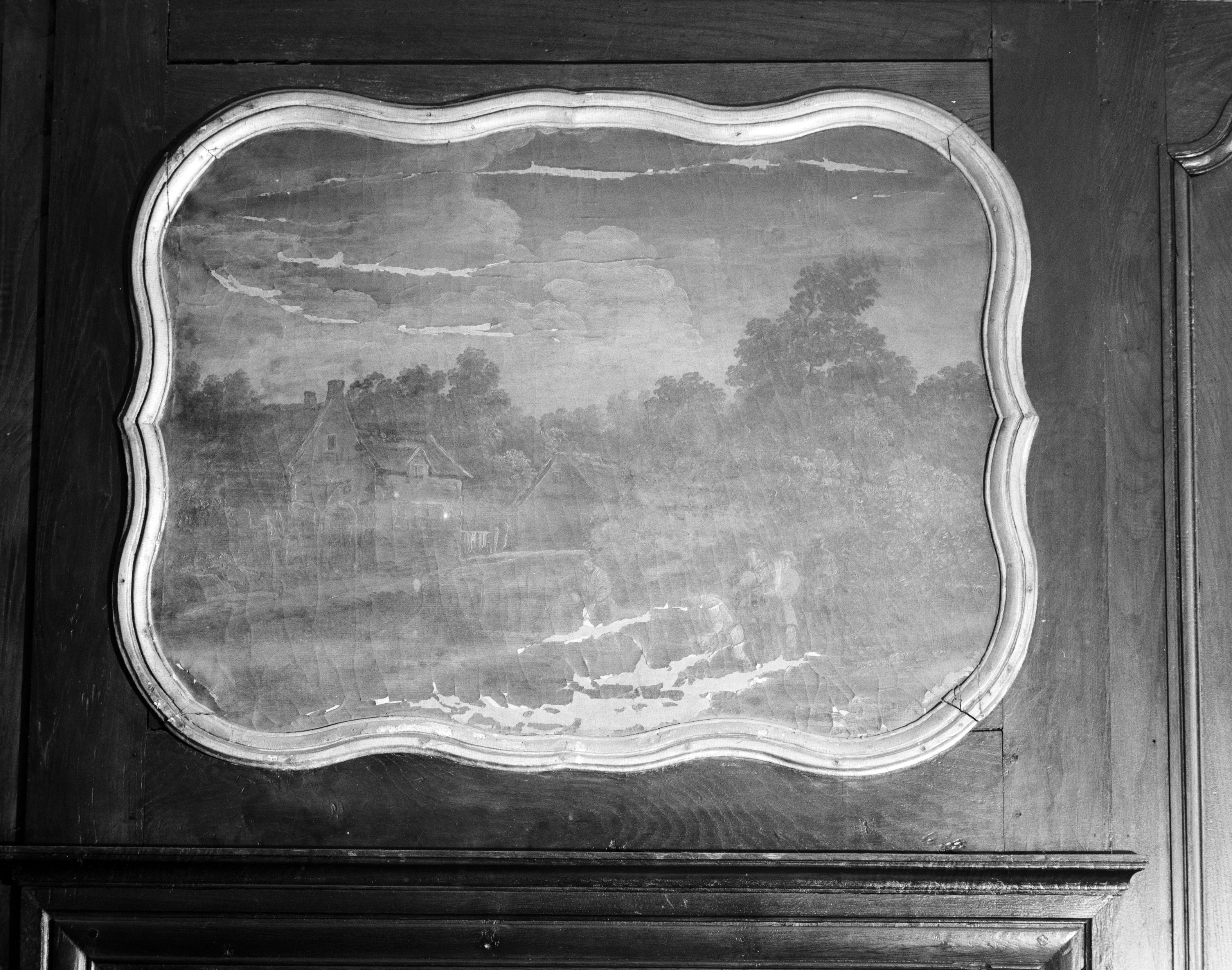 Maison, trumeau : Scène rurale (labour ?) avec quatre personnages devant des maisons et un moulin à eau ? (coll. part.)Immatriculation