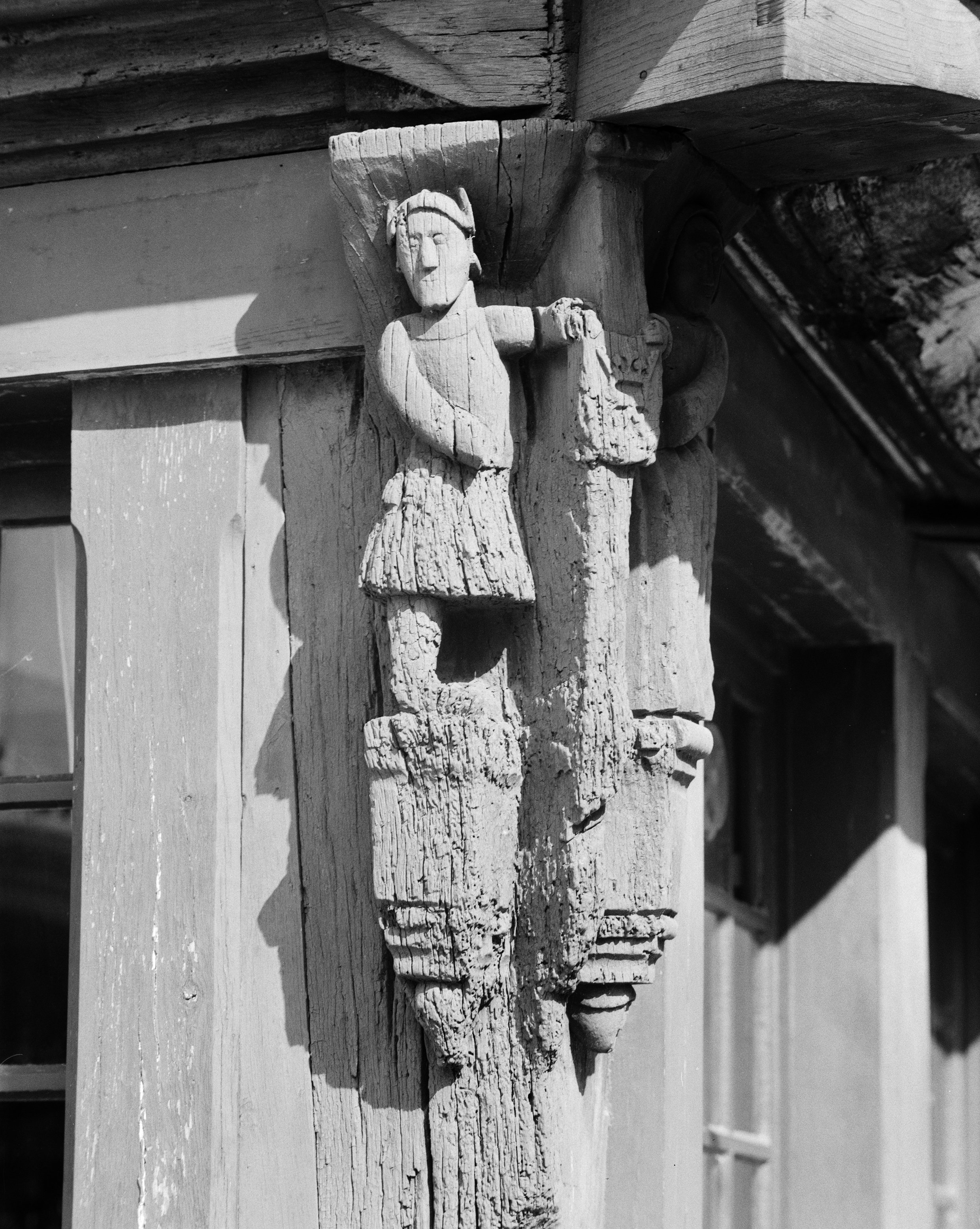 Maison, rez-de-chaussée, décor du poteau cornier : un homme et une femme présentent un écu avec une marque de marchand ou un monogramme (état en 1992)Immatriculation