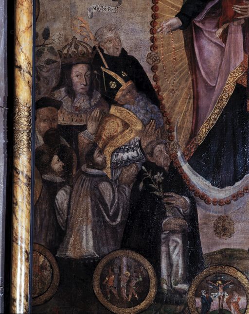 Tableau d'autel : Don du Rosaire à saint Dominique et à sainte Catherine de Sienne, en présence de saints et de donateurs, église Saint-Bertin (Guillac),