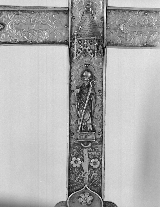 Croix de procession : revers, statuette de saint GobrienImmatriculation