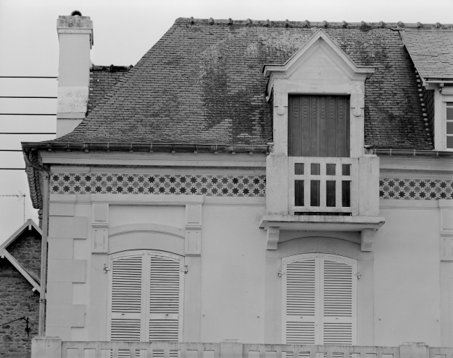 Villa Bambino, détail d'une lucarne et de la frise en céramique côté jardin.Immatriculation