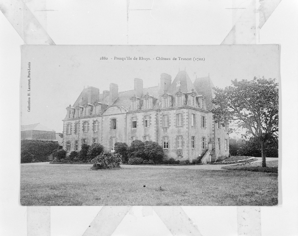 Château, vue générale, château de Truscat (1702). (reproduction carte postale ancienne, vol. 4 Morbihan). Cl. Inv. P. Corbière.Immatriculation
