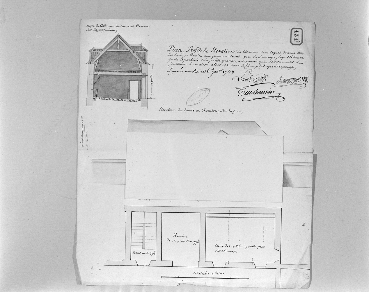 Ecuries sur la cour du logis, plan au sol, projet, 1743 (Doc. A.D. Morbihan).Immatriculation