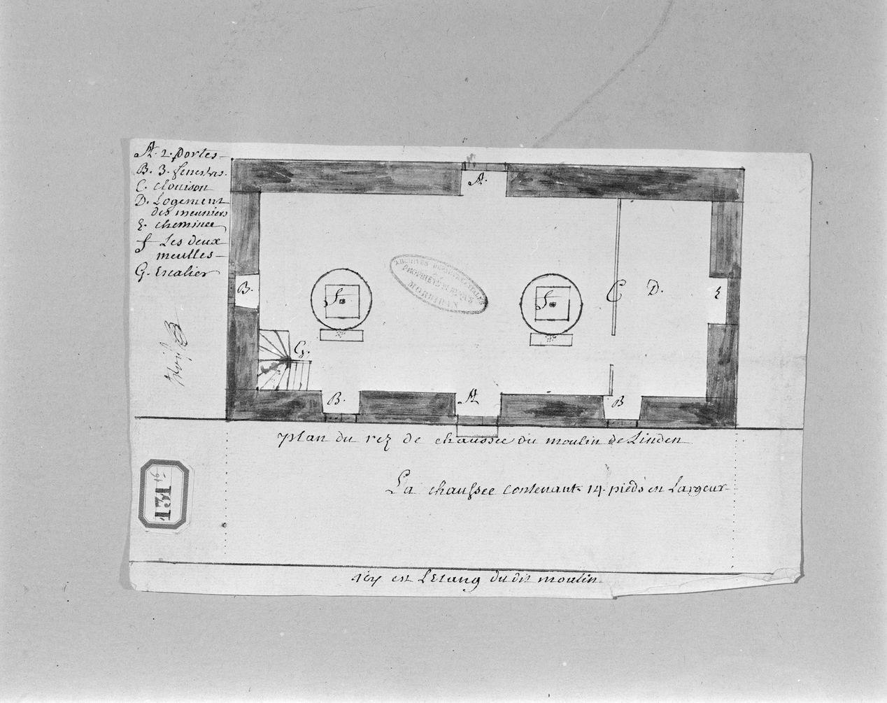 Sarzeau, Le Lindin, moulin de Lindin, plan du rez-de-chaussée du moulin, dessin 131-16. (Archives Départementales Vannes).Immatriculation
