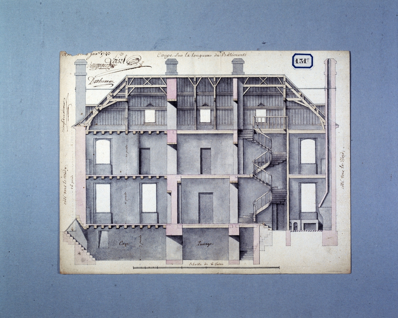 SAINT-GILDAS DE RHUYS, place Monseigneur Ropert, abbaye église paroissiale Saint-Gildas, logis abbatial, coupe longitudinale, projet 1743 (Doc. A.D. Morbihan).Immatriculation