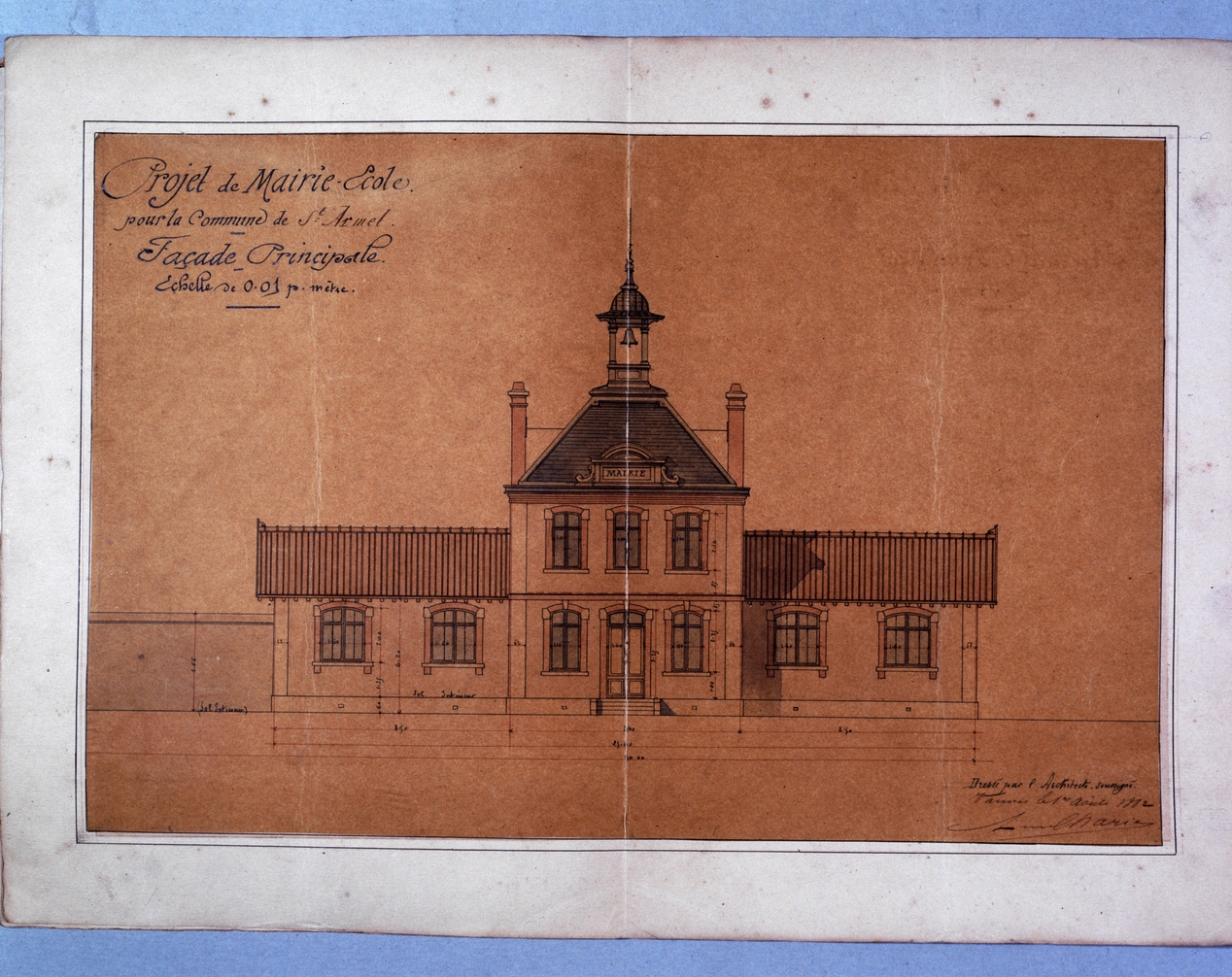 Projet de mairie, élévation par Charier, 1882 (Doc. A.D. Morbihan).Immatriculation